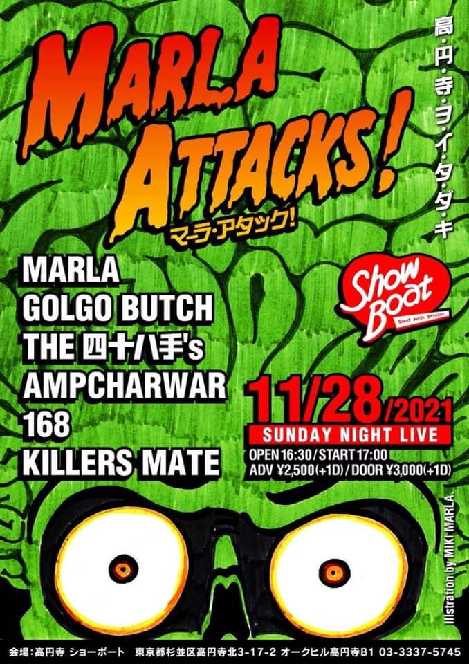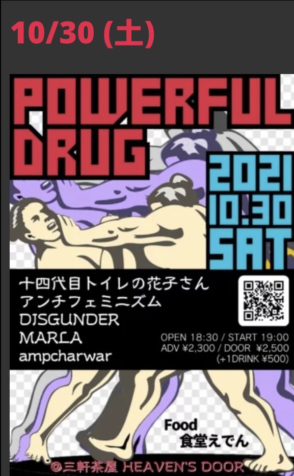 脱力ムードの皆さんに闘魂注入!超過激パフォーマンスで「生」を体現する『アンチフェミニズム』、カワイイ幽霊になりすましアンダーグラウンドを地で行く『十四代目トイレの花子さん』、令和版Riot Grrrlとも言えるグランジ遺伝子の申し子『MARLA』、縦横無尽に荒れ狂う超速グラインドハードコア『DISGUNDER』など否応でもボルテージアップする起爆剤五銃士が大暴れ!!